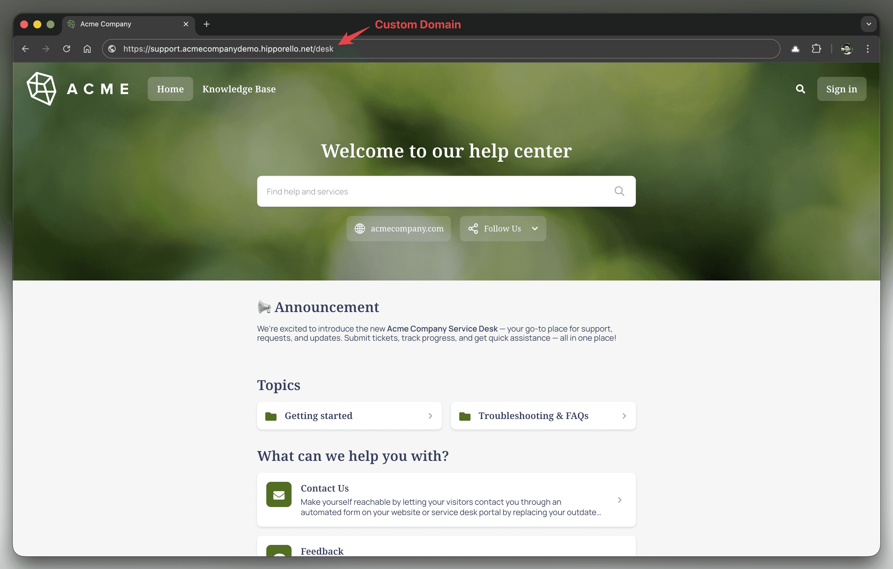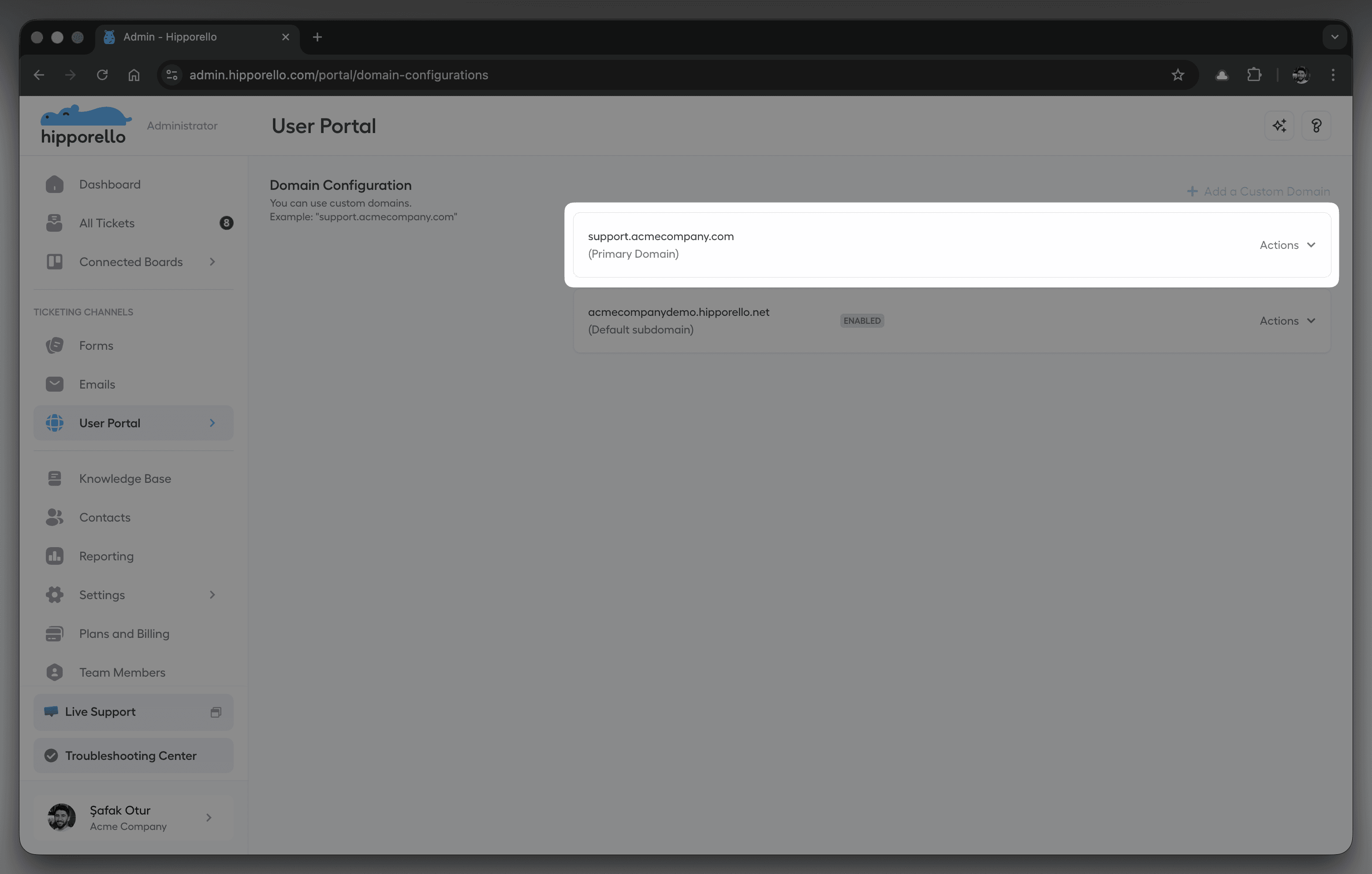 There is one more powerful step that helps you make the experience truly seamless and coherent for your endusers: using a custom domain. Instead of directing your users to a generic link, Hipporello allows you to define a custom domain and publish your service desk under your own branded subdomain such as support.yourcompany.com.