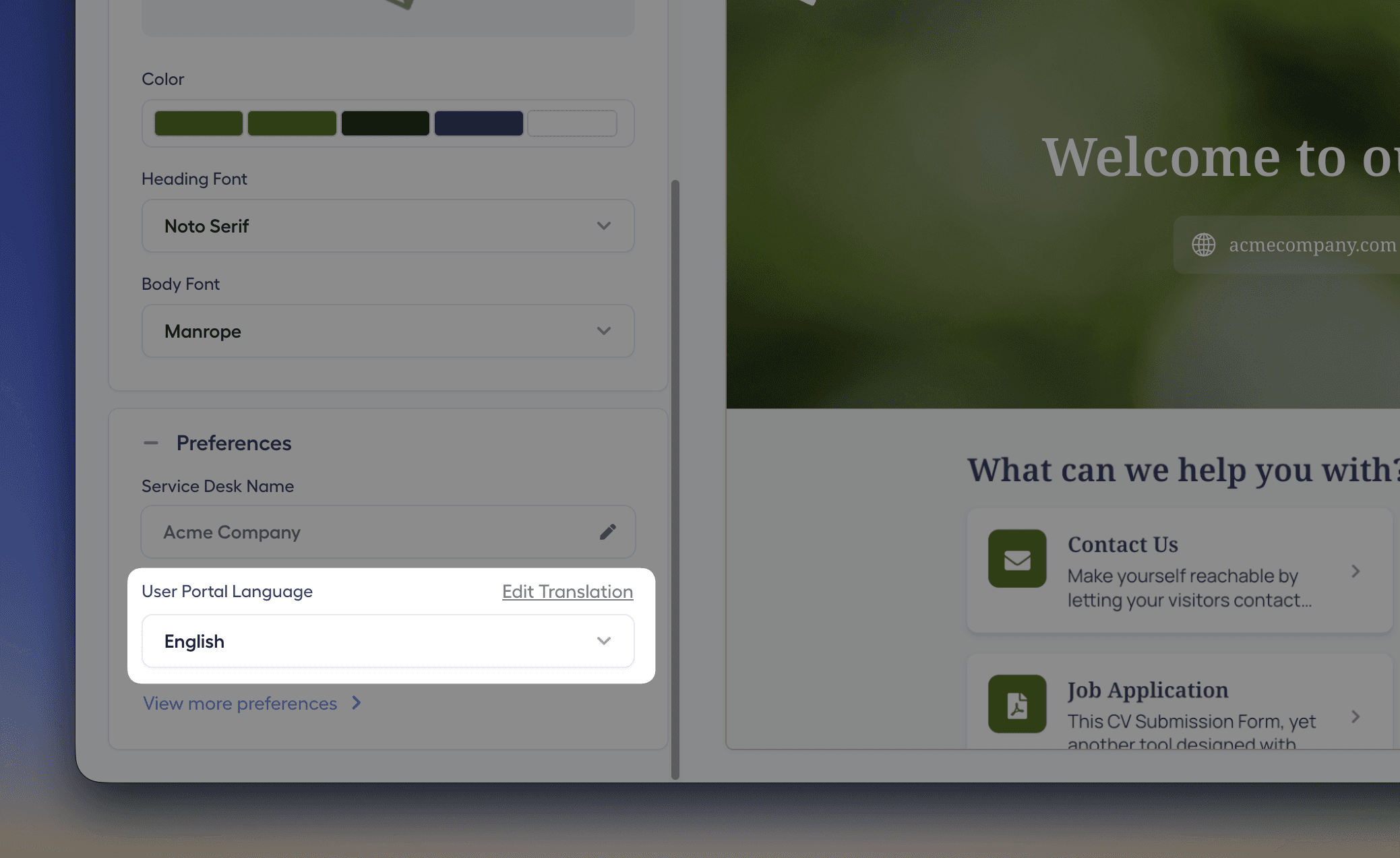 In this section you can select your brand colors and fonts for headings and body text. Choose a font that matches your brand voice. Every visual decision here reinforces your brand personality, helping your service desk feel less like a generic tool and more like an integrated part of your business.