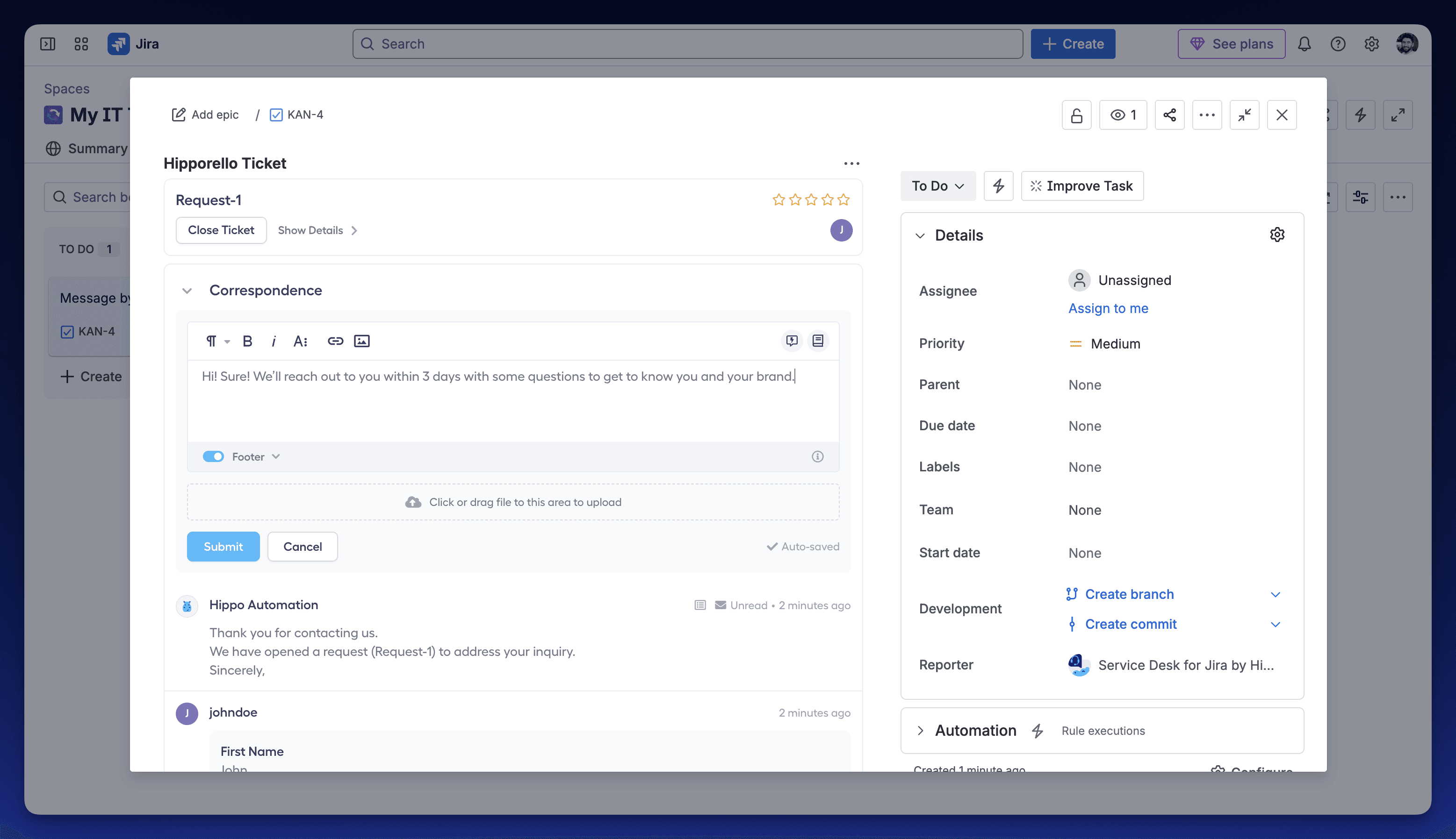 Each generated Jira issue includes submission metadata such as the requester’s country, IP address, browser type, and submission channel. Teams can add internal comments to coordinate work privately.