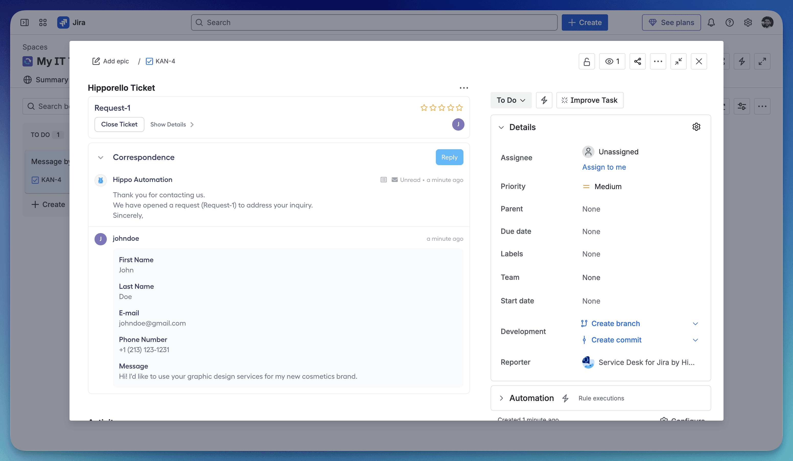 This section explains how to use Service Desk forms to collect customer requests and inquiries. Every form submission made through your User Portal automatically creates a Jira issue, ensuring that each request is logged and ready for processing.