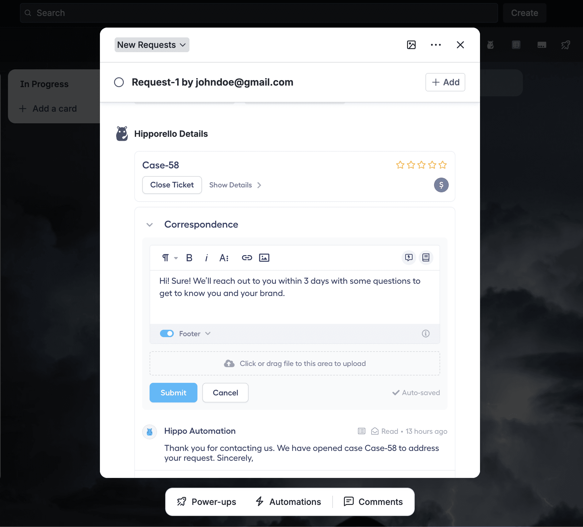 Teams can communicate directly with the requester from the Trello card using Hipporello’s in-card conversation module or by replying to notification emails. This centralized communication helps keep all discussions related to the request in one place.