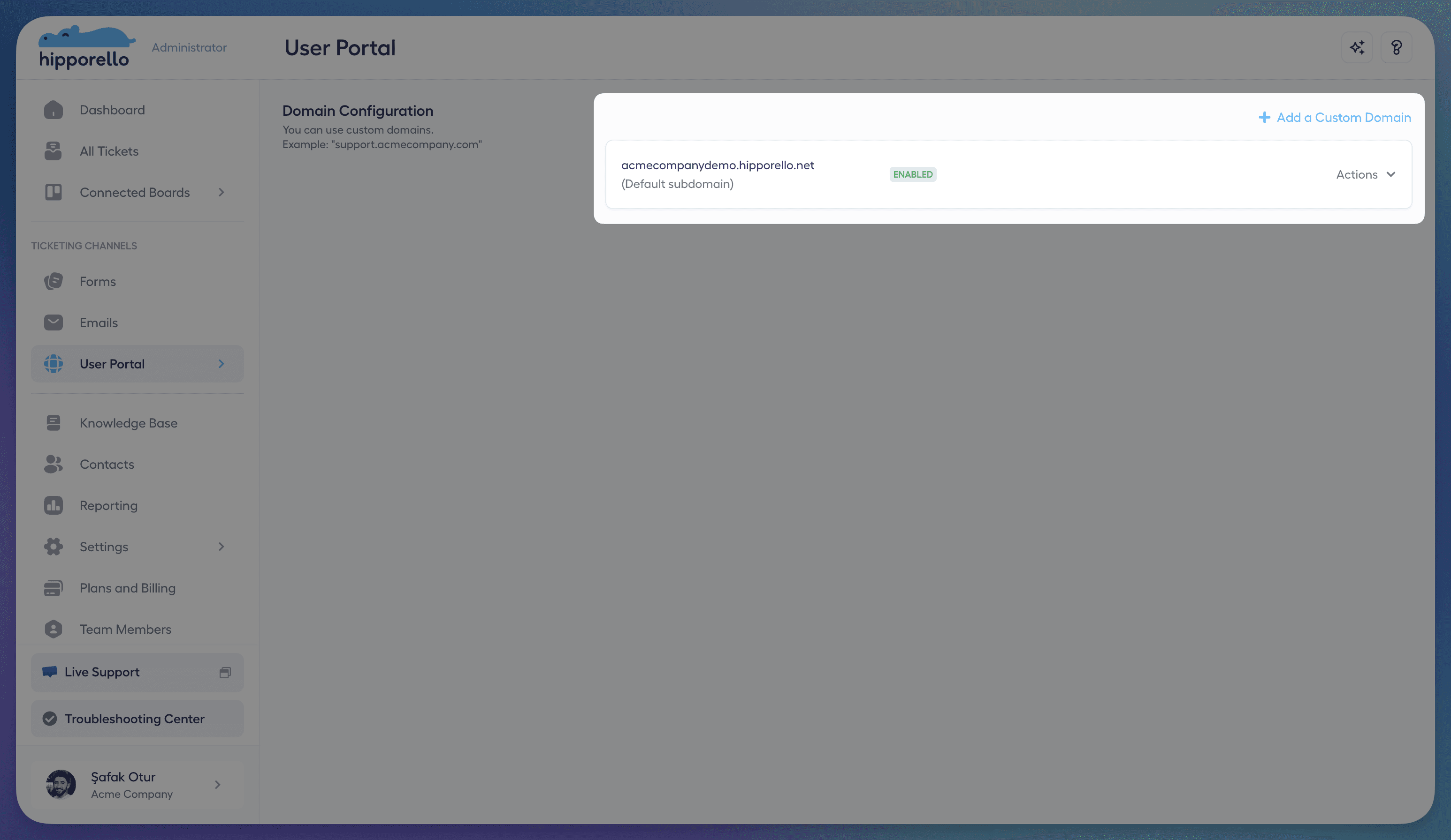 Navigate to Hipporello Admin → User Portal → Domain Configuration