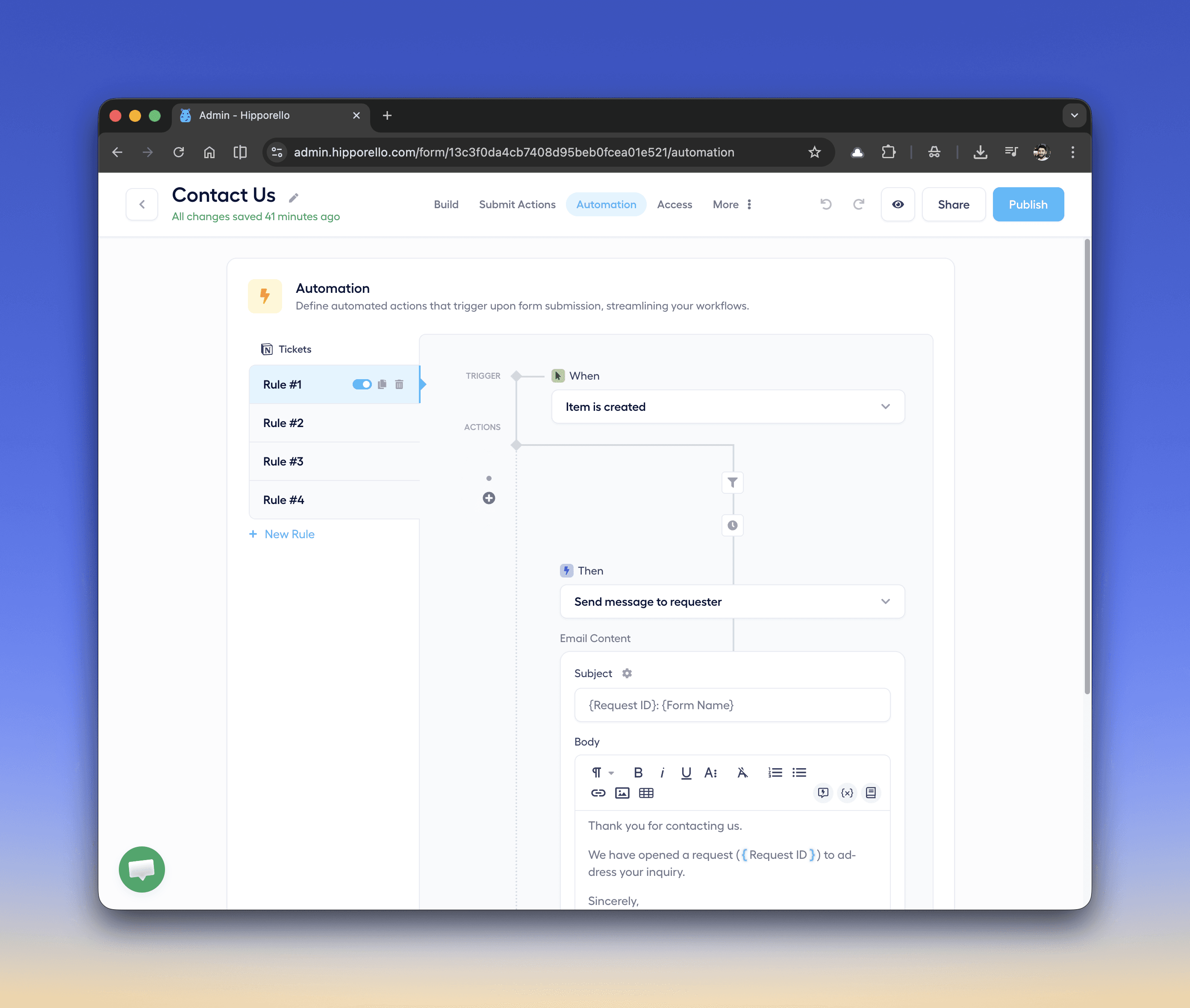 For example, when a new item is created from a form submission, an automation rule can immediately send a confirmation email to the requester.